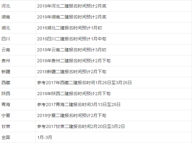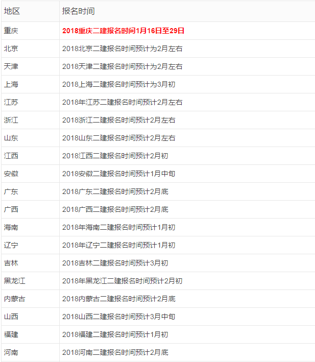 重慶市的報名時間已公布,其它省份的也不遠(yuǎn)了,下表為各省份2018二建報名時間預(yù)測(紅色表示已更新),小編會在各個省份報名時間出來的時候及時告知大家,請大家繼續(xù)關(guān)注!