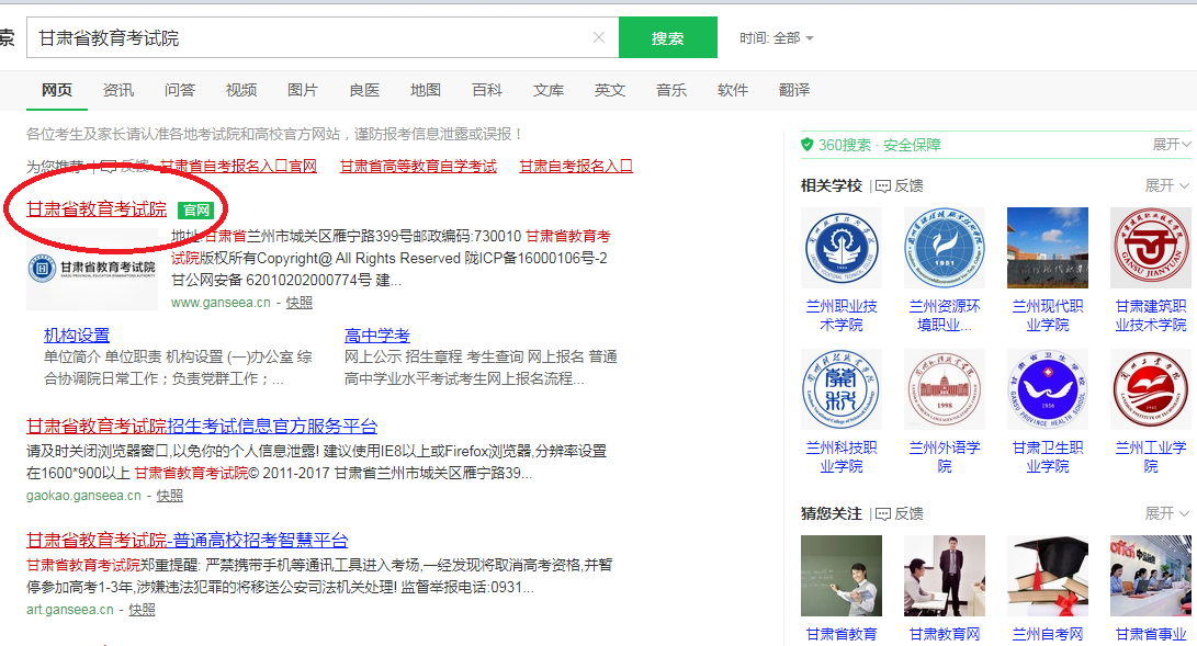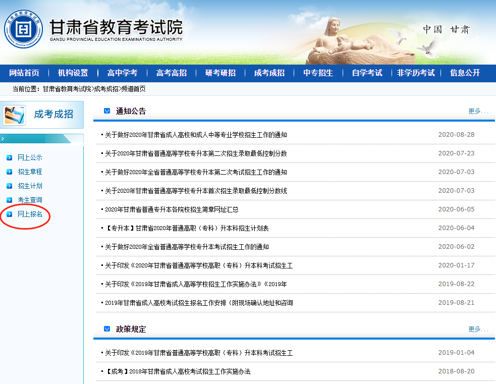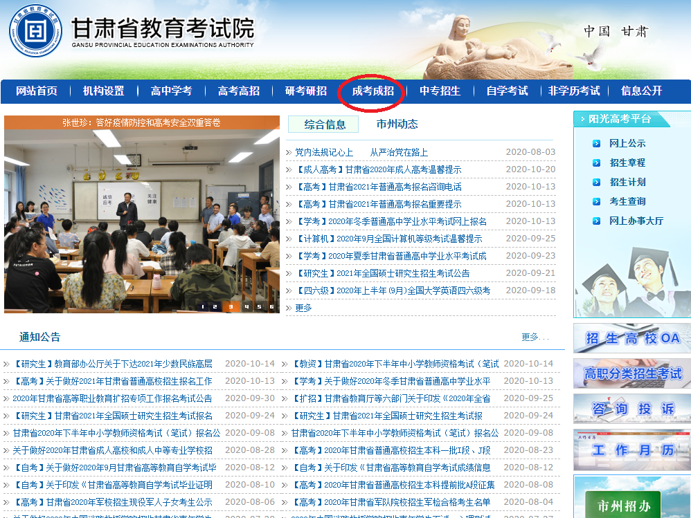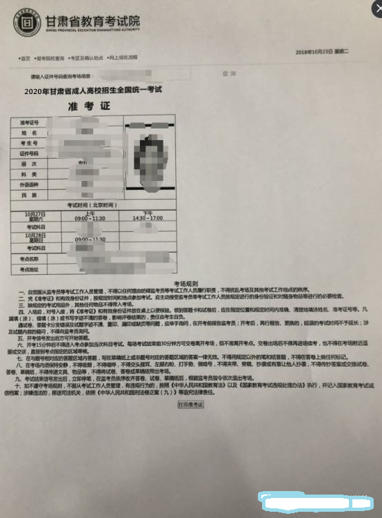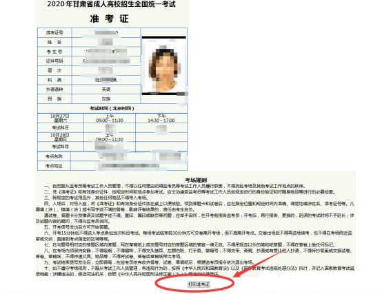 二、新冠肺炎確診病例、無癥狀感染者、疑似患者、確診病例密切接觸者等“四類人員”不得參加考試。三、考生進入考點、考場時不得因為佩戴口罩影響身份識別。考試期間,考生自備口罩。考生在進入考場前必須佩戴口罩,進入考場后建議考生全程佩戴口罩。隔離考場的考生必須全程佩戴口罩。四、考試期間,考生必須嚴格遵守《2020年甘肅省成人高考防疫工作方案》要求和成人高考相關規定,完全服從考點工作人員安排。五、10月21日起,考生登錄甘肅省教育考試院網站自行打印準考證(具體打印流程見第八條)。同時打印《2020年甘肅省成人高考考生安全考試承諾書及身體健康狀況監測表》(見附件2),并簽字確認,于第一場考試時交監考人員。六、考生不得提供身體健康狀況虛假信息。對于隱瞞行程、隱瞞病情、故意壓制癥狀、瞞報漏報健康情況的考生,一經發現,一律不得參加考試,并追究本人及相關人員的責任。七、開考15分鐘后考生不得進入考場,離考試結束前30分鐘方準交卷離場。1、瀏覽器搜索http://www.ganseea.cn/進入甘肅省教育考試院官方網站;